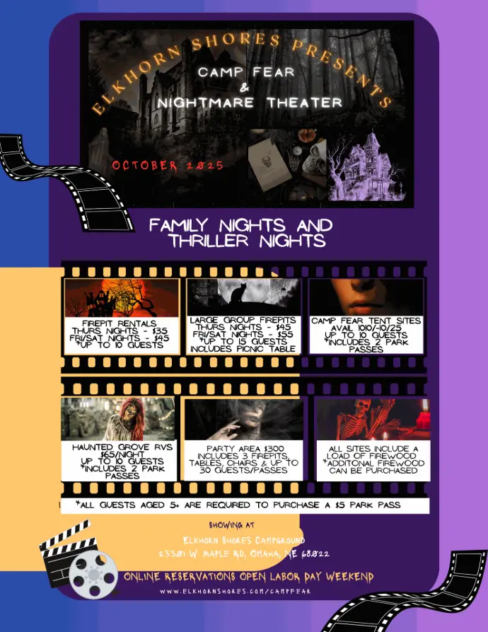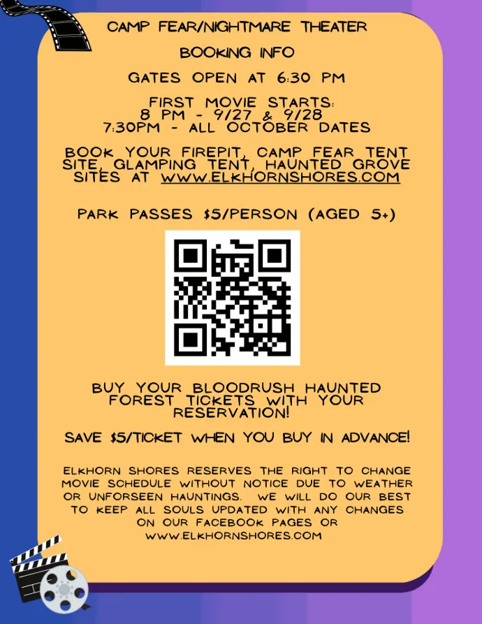 ELKHORN SHORES RESERVES THE RIGHT TO CHANGE MOVIE SCHEDULE WITHOUT NOTICE DUE TO WEATHER OR UNFORSEEN HAUNTINGS. WE WILL DO OUR BEST TO KEEP ALL SOULS UPDATED WITH ANY CHANGES ON OUR FACEBOOK PAGES OR WWW.ELKHORNSHORES.COM