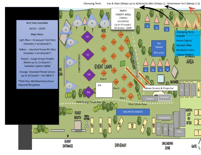 Our Graveyard Tent Sites offer the finest views of the big screen. We reduced the number this year to give guests more space. They are reserved for the nearly departed. Some plots are positioned directly in front of the screen, while others overlook the river Styx.